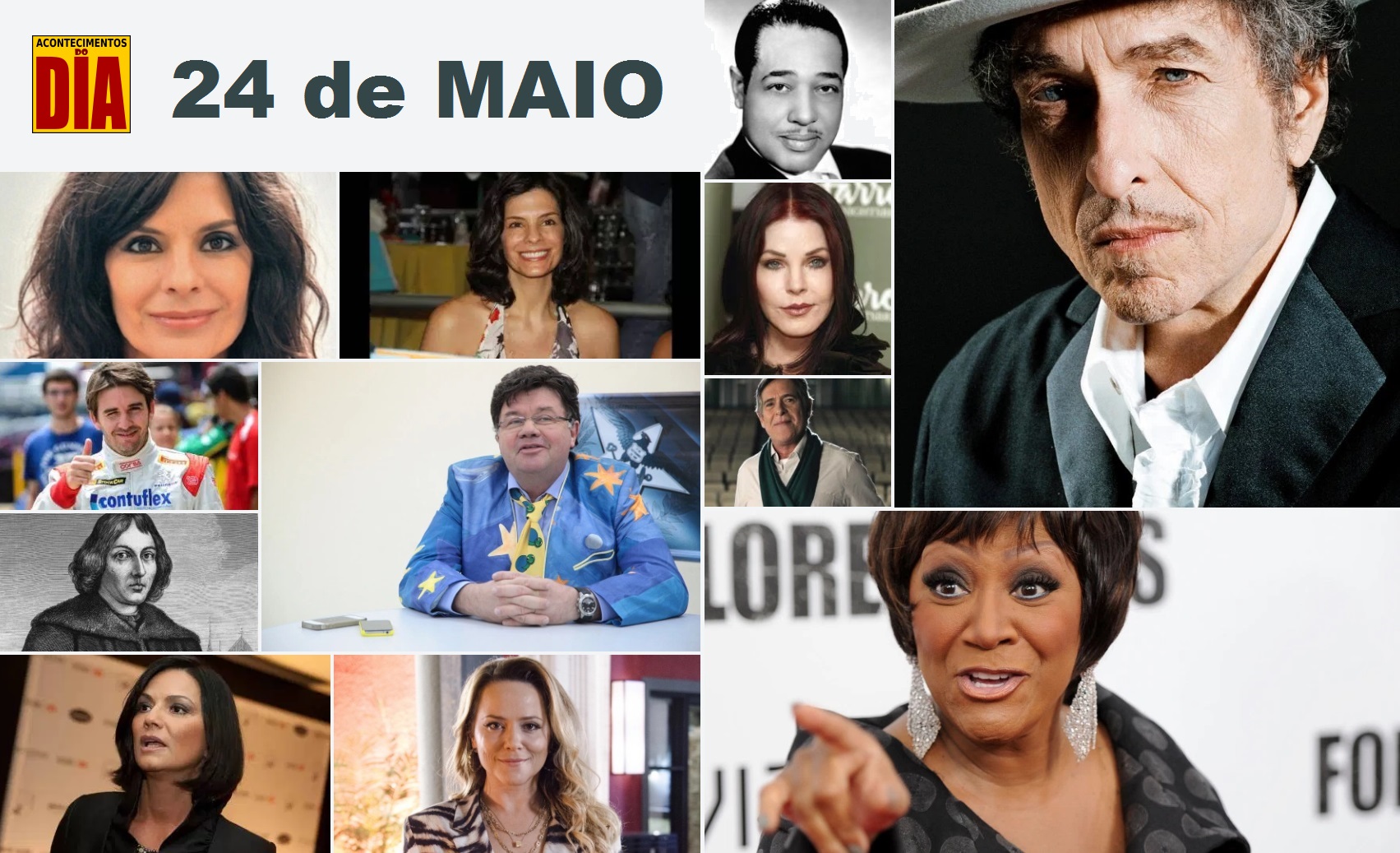 ☺ DESTAQUES DE HOJE ▒ NASCIMENTOS • Bob Dylan • Patti LaBelle • Priscilla Presley • José de Abreu • Marcelo Madureira • Luiza Brunet • Helena Ranaldi • Vivianne Pasmanter • Popó Bueno ▒ FALECIMENTOS • Nicolau Copérnico • Duke Ellington