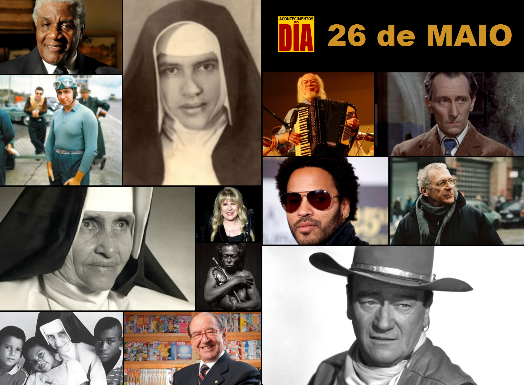 ☺ DESTAQUES DE HOJE ▒ NASCIMENTOS • John Wayne • Peter Cushing • Irmã Dulce • Miles Davis • Sivuca • Toni Tornado • Stevie Nicks • Lenny Kravitz ▒ FALECIMENTOS • Alberto Ascari • Sydney Pollack • Roberto Civita