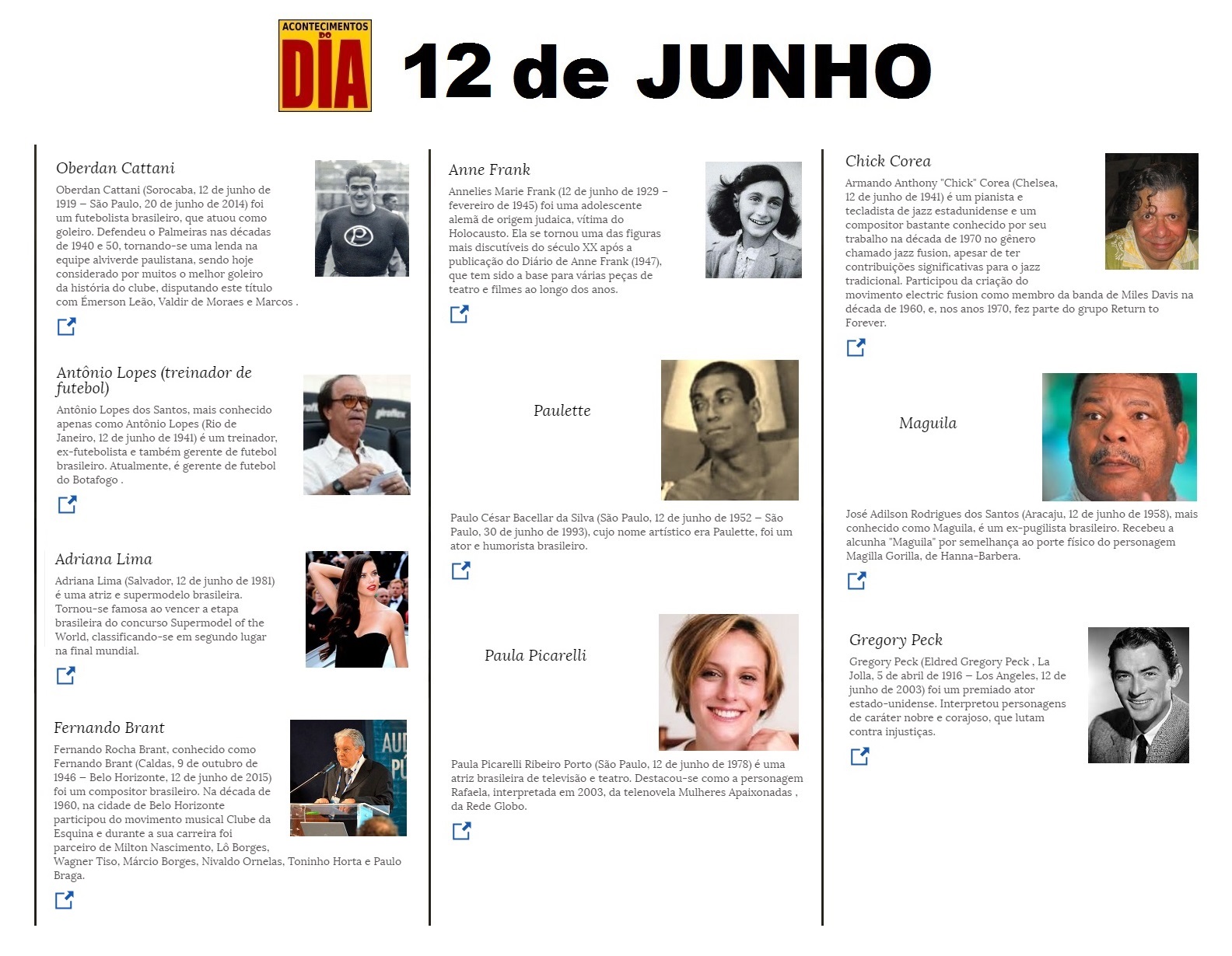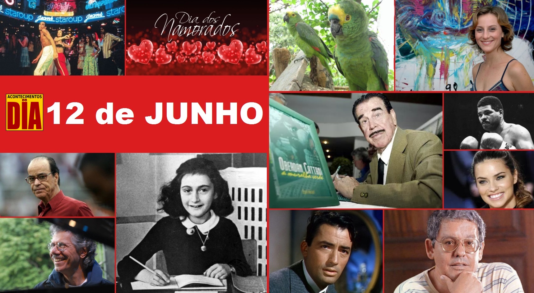 ☺ DESTAQUES DE HOJE • Dia dos Namorados ▒ NASCIMENTOS • Oberdan Cattani • Anne Frank • Chick Corea • Antônio Lopes • Paulette • Maguila • Paula Picarelli • Adriana Lima ▒ FALECIMENTOS • Gregory Peck • Fernando Brant