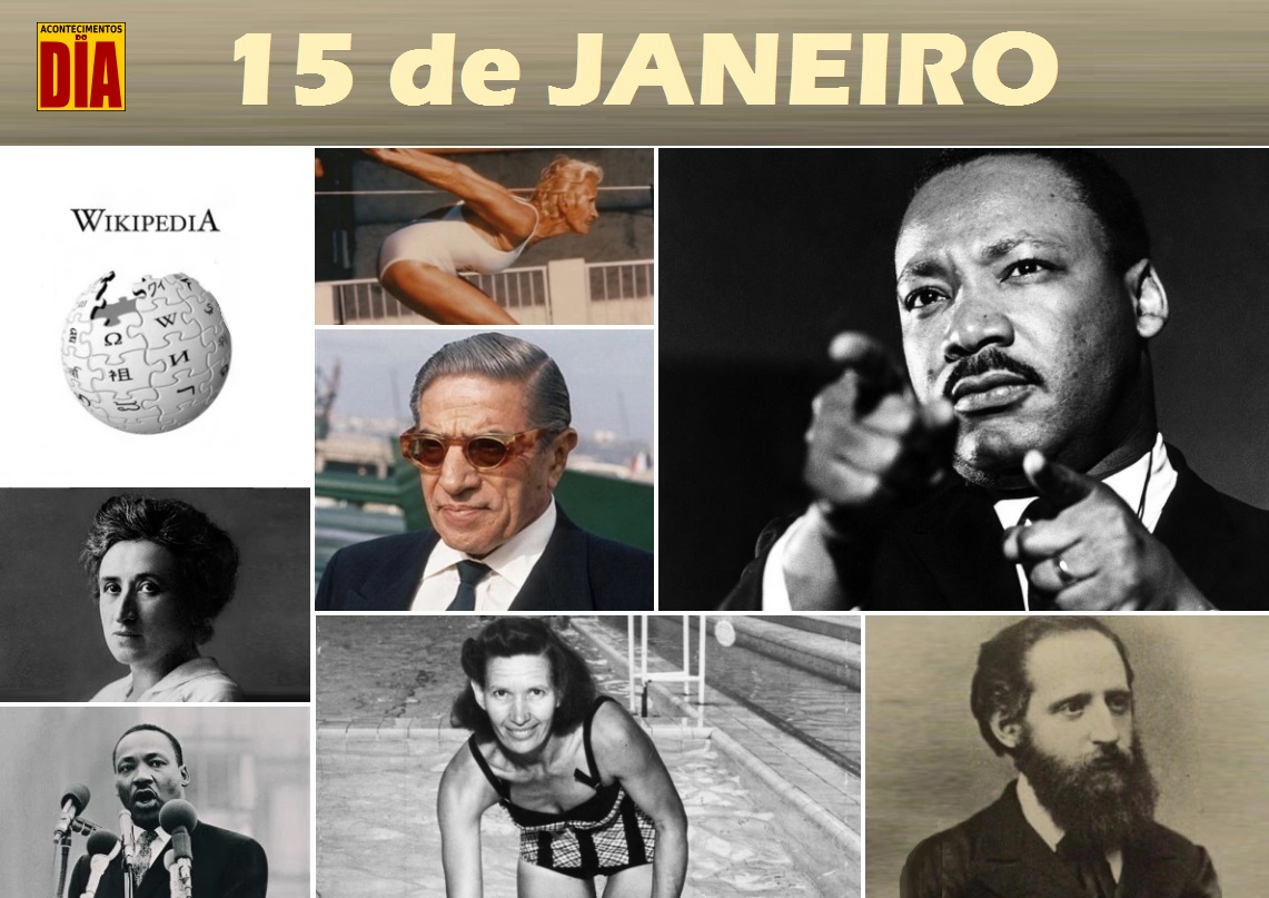 ☺ DESTAQUES DE HOJE • Dia da Wikipédia – desde 2001 (fazendo 16 anos de idade em 2017) ▒ NASCIMENTOS • Josef Breuer • Aristóteles Onassis • Maria Lenk • Martin Luther King Jr. ▒ FALECIMENTOS • Rosa Luxemburgo