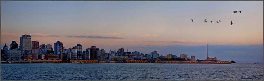 O centro da cidade junto ao Guaíba, a linha de armazéns históricos do Cais Mauá e à direita a alta chaminé da Usina do Gasômetro, ambos ícones arquitetônicos de Porto Alegre (RS).