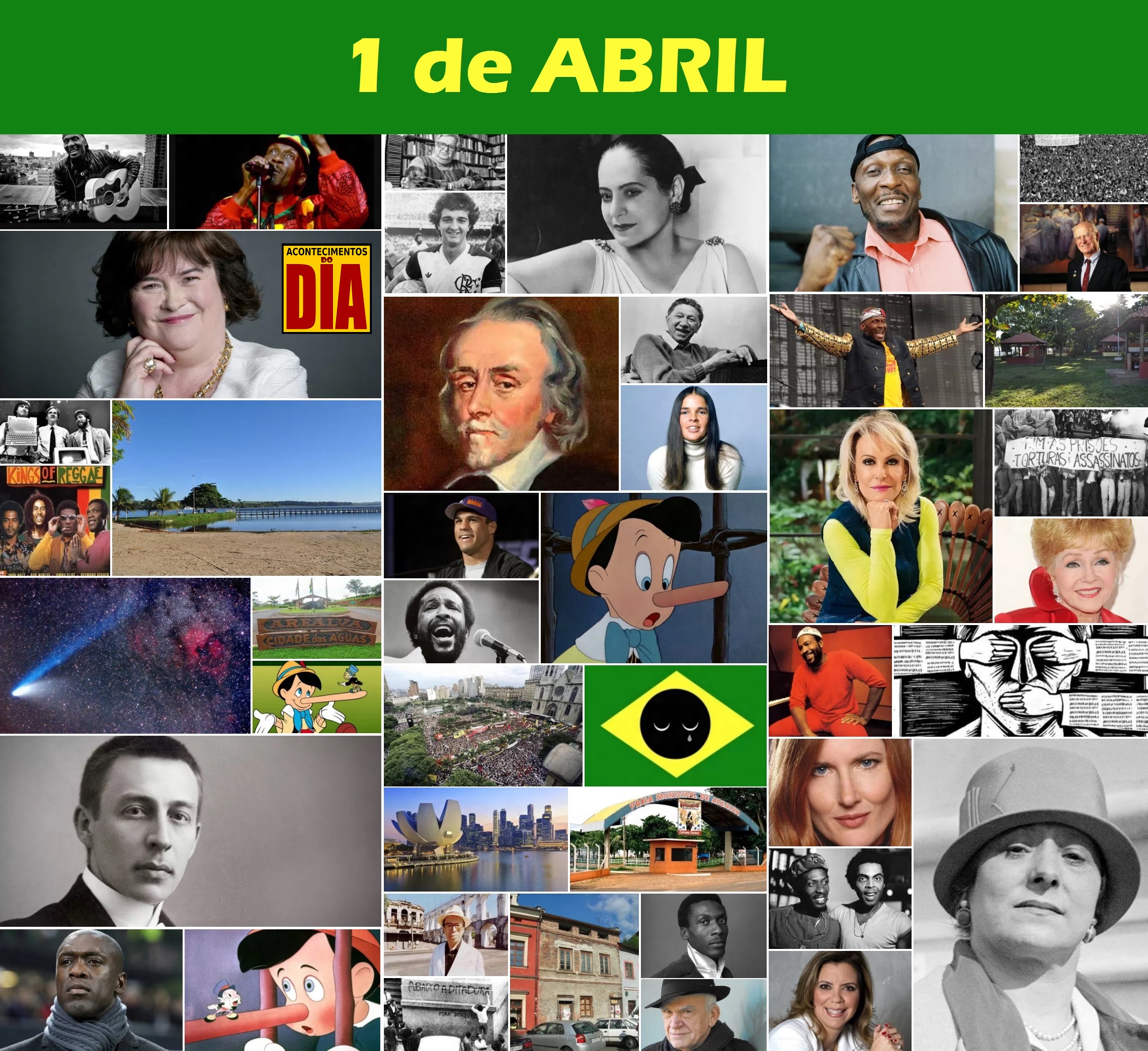 ☺ DESTAQUES DE HOJE ▒ CAPA • Jimmy Cliff ▒ NASCIMENTOS • William Harvey • Sergei Rachmaninoff • Moreira da Silva • Abraham Maslow • Joseph Murray • Milan Kundera • Debbie Reynolds • Ali MacGraw • Ana Maria Braga • Annette O’Toole • Tita • Susan Boyle • Astrid Fontenelle • Clarence Seedorf • Vítor Belfort ▒ CIDADE • Arealva (SP) ▒ FALECIMENTOS • Helena Rubinstein • Marvin Gaye • Marcos Rey