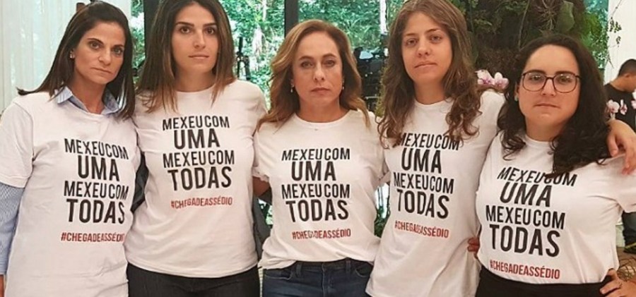 Em virtude do episódio de assédio sexual a uma figurinista por parte do famoso ator global, José Mayer, funcionárias da TV Globo foram trabalhar com camisetas que estampavam em letras enormes a frase “Mexeu com uma, mexeu com todas”, acompanhada da hashtag #CHEGADEASSÉDIO.