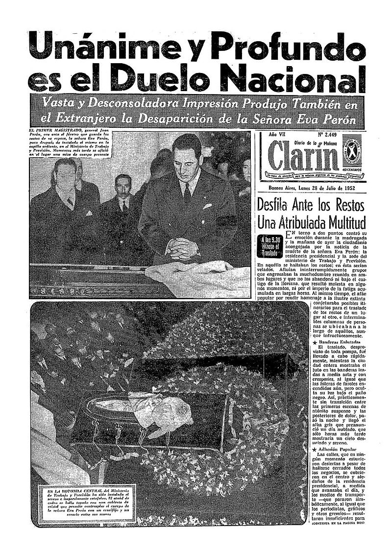 Funeral de Eva Perón no jornal ‘O Clarin’.