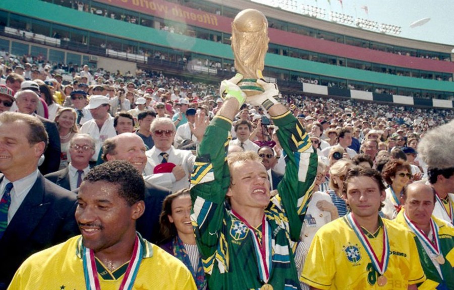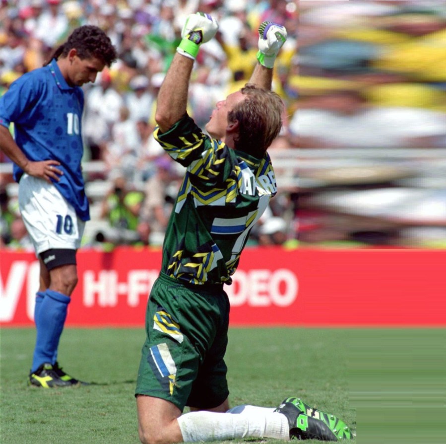 Cláudio Taffarel comemorando a conquista da Copa do Mundo de 1994, com Roberto Baggio ao fundo.