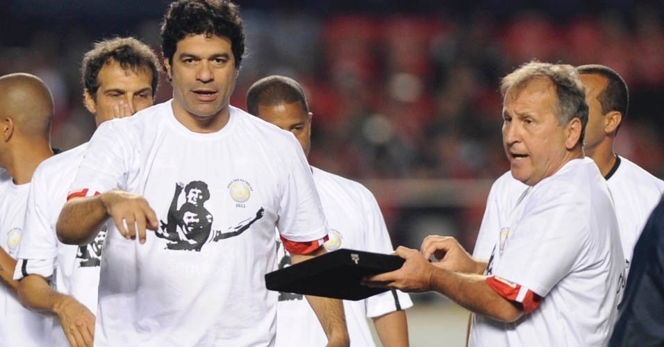 Raí recebe das mãos de Zico placa de homenagem a Sócrates.