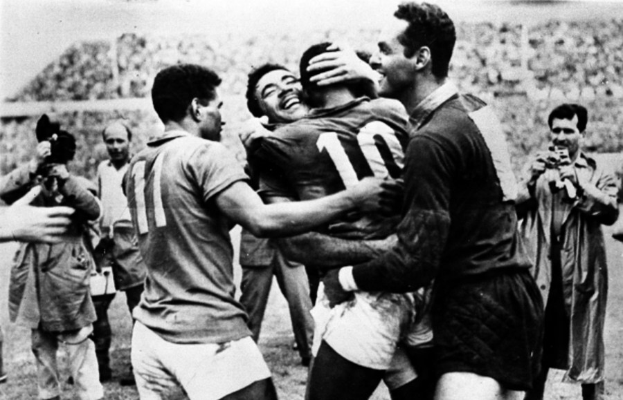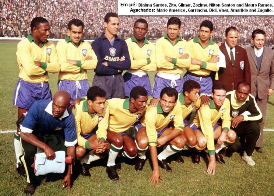 Brasil 1958 – Vicente Feola (treinador), Djalma Santos, Zito, Bellini, Nilton Santos, Orlando, Gylmar – Garrincha, Didi, Pelé, Vava, Zagallo.