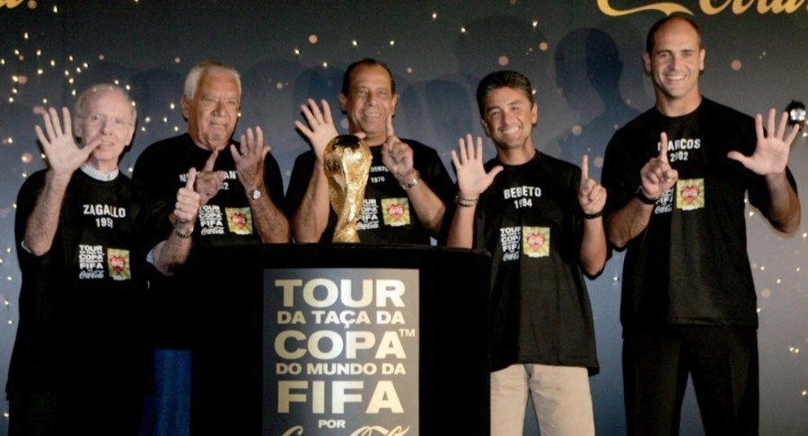 Nilton Santos com todas gerações campeãs da seleção brasileira de futebol masculino.