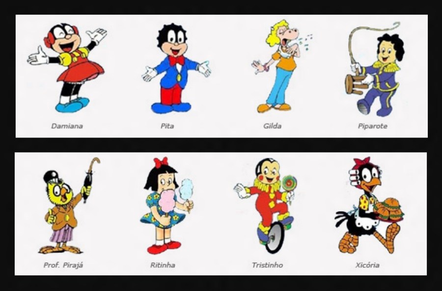 Ritinha, Piparote, Tristinho, Gilda, Pita, Professor Pirajá, Damiana e a simpática galinha Xicória eram os personagens.