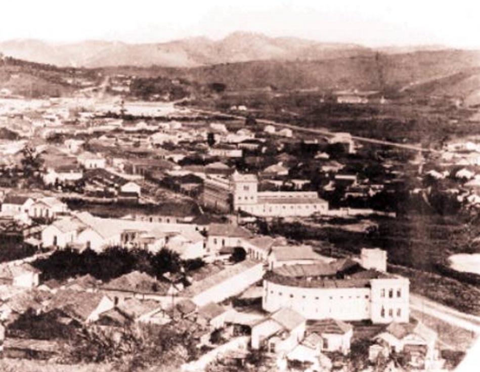 Vista panorâmica da cidade em 1893. Ao fundo, a Companhia Têxtil Bernardo Mascarenhas e à direita, em primeiro plano, a antiga cadeia, atual Escola Normal. – Juiz de Fora