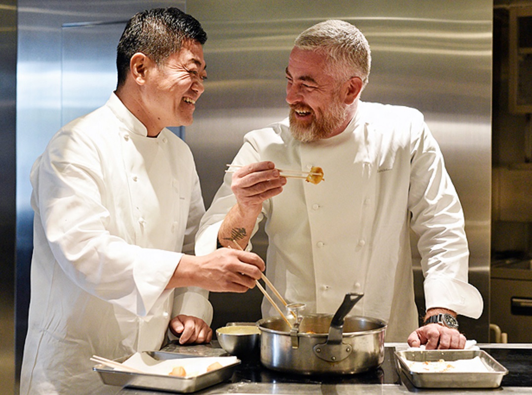 Os chefs Alex Atala e Yoshihiro Narisawa na cozinha do restaurante Narisawa, em Tóquio.