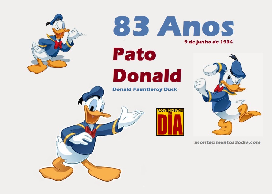 1934 — Pato Donald ▒ O Pato Donald (em inglês: ‘Donald Duck’)[1] é um personagem de desenhos animados e histórias em quadrinhos dos estúdios de Walt Disney, criado em 1934. Ele aparece em vários desenhos como antagonista antipático, principalmente naqueles em que aparece junto de Mickey Mouse ou de seus sobrinhos Huguinho, Zezinho e Luisinho.