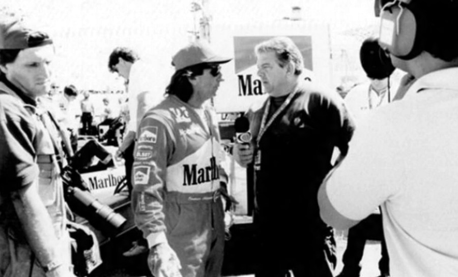 Luciano do Valle durante entrevista com o piloto Emerson Fittipaldi na época de Indy.