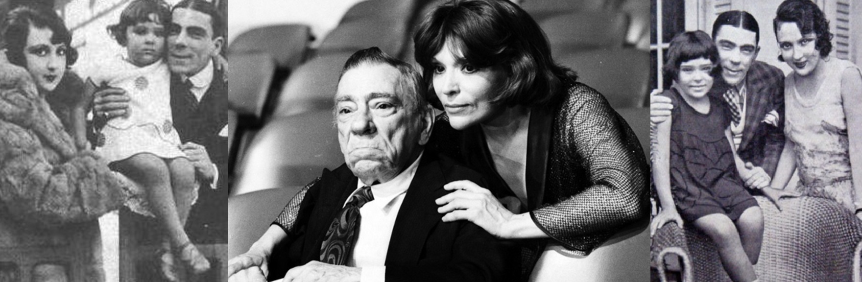 Procópio Ferreira com a esposa Aída Izquierdo e a filha Bibi Ferreira, ainda criança e adulta.