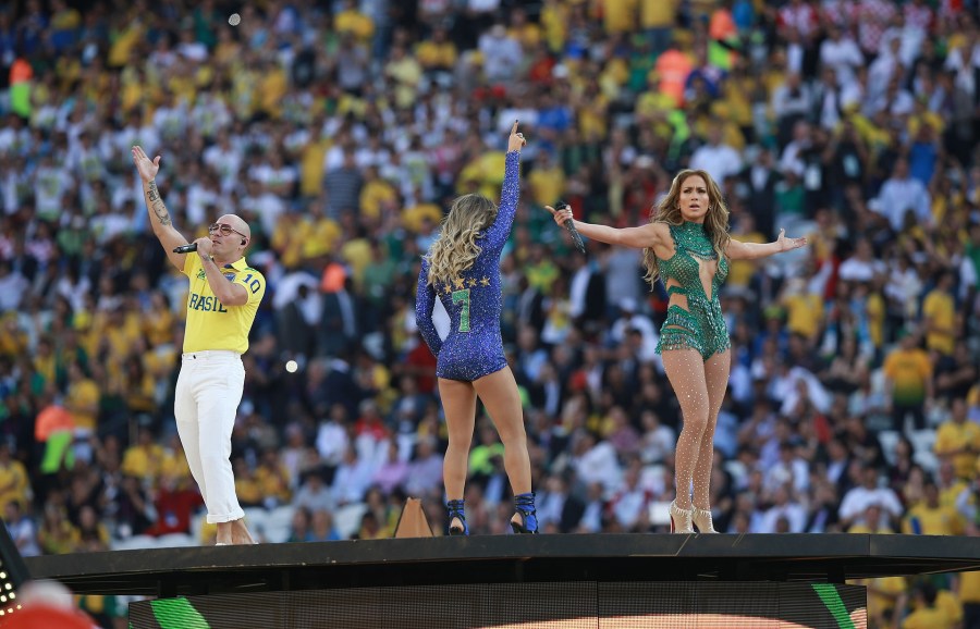 Pitbull, Claudia Leitte e Jennifer Lopez na cerimônia de abertura da Copa do Mundo de 2014.