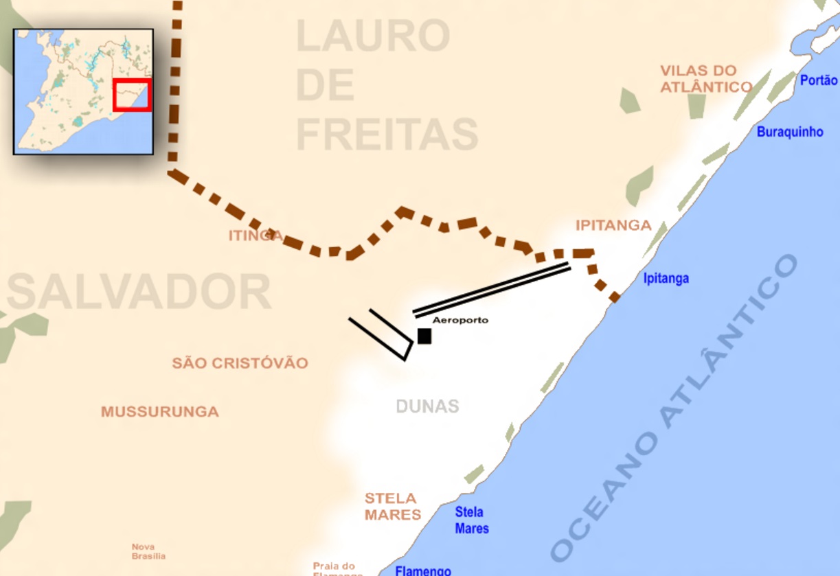 31 de Julho – Mapa com localização do Aeroporto e de praias de Lauro de Freitas e parte das praias de Salvador – Lauro de Freitas (BA) — 55 Anos em 2017.