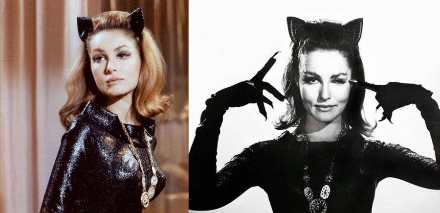 1933 – Julie Newmar ▒ Julie Newmar (nascida em Los Angeles, 16 de agosto de 1933) é uma atriz, dançarina e cantora, estadunidense, foi a intérprete mais famosa da vilã Mulher-Gato na série de televisão do Batman. Para a série de televisão do Batman, Julie Newmar desenhou um traje que deixava à mostra o seu corpo de dançarina. Era feito de lurex (lycra brilhante como purpurina).
