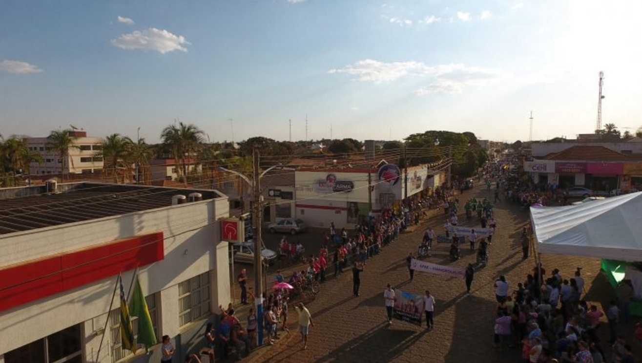 19 de Agosto – Foto aérea do desfile cívico ao cair da tarde — Vianópolis (GO) — 69 Anos em 2017.
