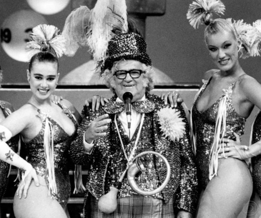 Conhecido como Velho Guerreiro, em 1987 foi homenageado pela Escola de Samba carioca Império Serrano com o enredo “Com a boca no mundo – Quem não se comunica se trumbica”, foi a única vez que desfilou numa escola de samba, surgiu no último carro alegórico, que reproduzia o cenário de seu programa, rodeado de chacretes, de Russo (1931-2017; seu assistente de palco) e Elke Maravilha (1945-2016).