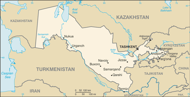 República do Uzbequistão (em usbeque: Ўзбекистон Республикаси; romaniz.: Oʻzbekiston Respublikasi), é um país duplamente encravado localizado na Ásia Central, composto de doze províncias, uma república autónoma e a capital Tasquente. O Uzbequistão faz fronteira com o Cazaquistão ao norte, o Tajiquistão a sudeste, o Quirguistão a nordeste, o Afeganistão ao sul e o Turcomenistão a sudoeste.