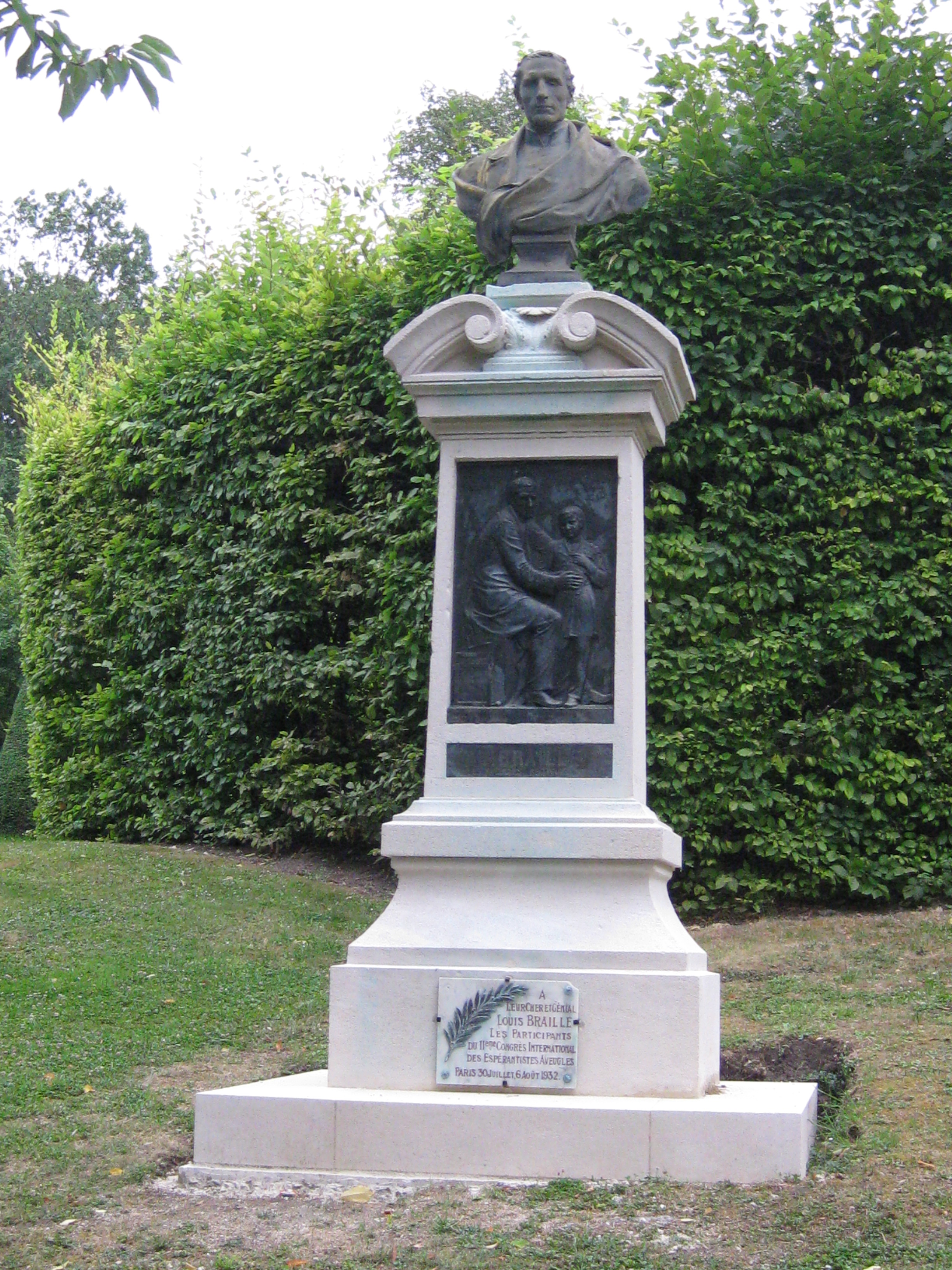 Com 3,20 m de altura, com pedestal de pedra branca, representa Luís Braille com o traje do INJA (Instituto Nacional de Jovens Cegos). O artista teria se inspirado em sua máscara mortuária para representá-lo.