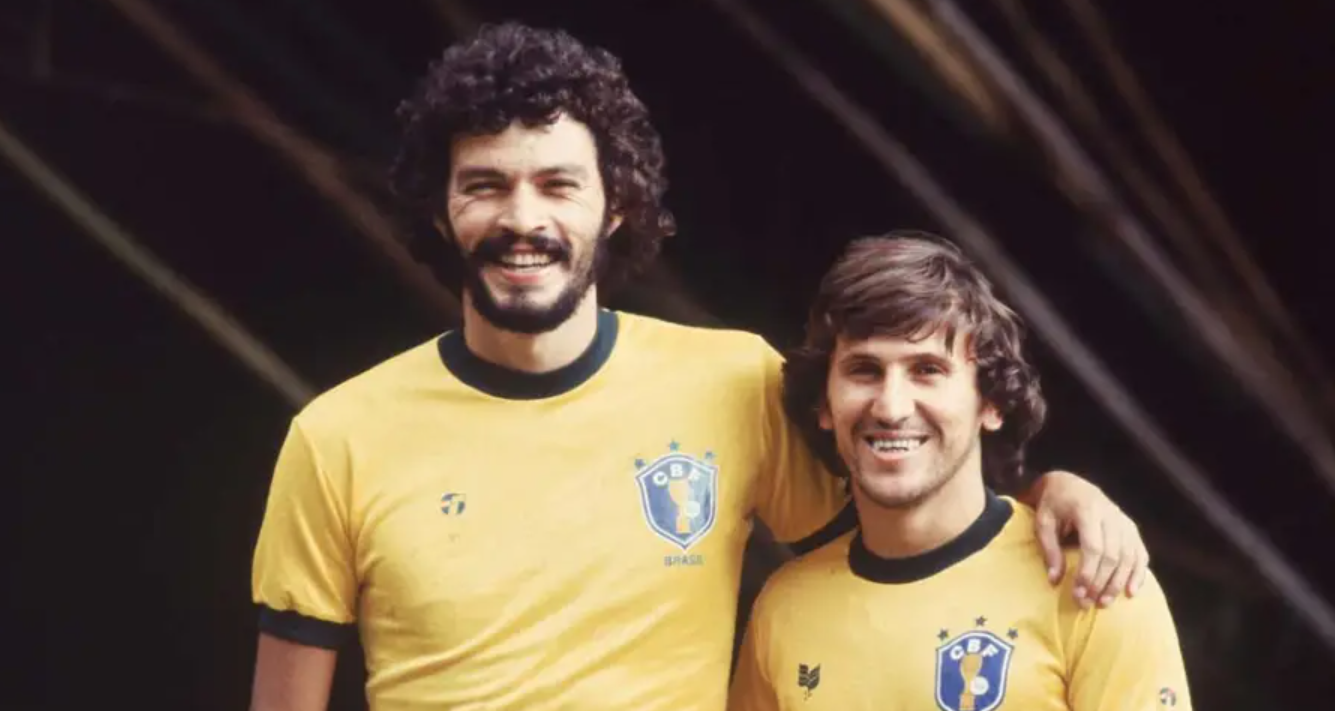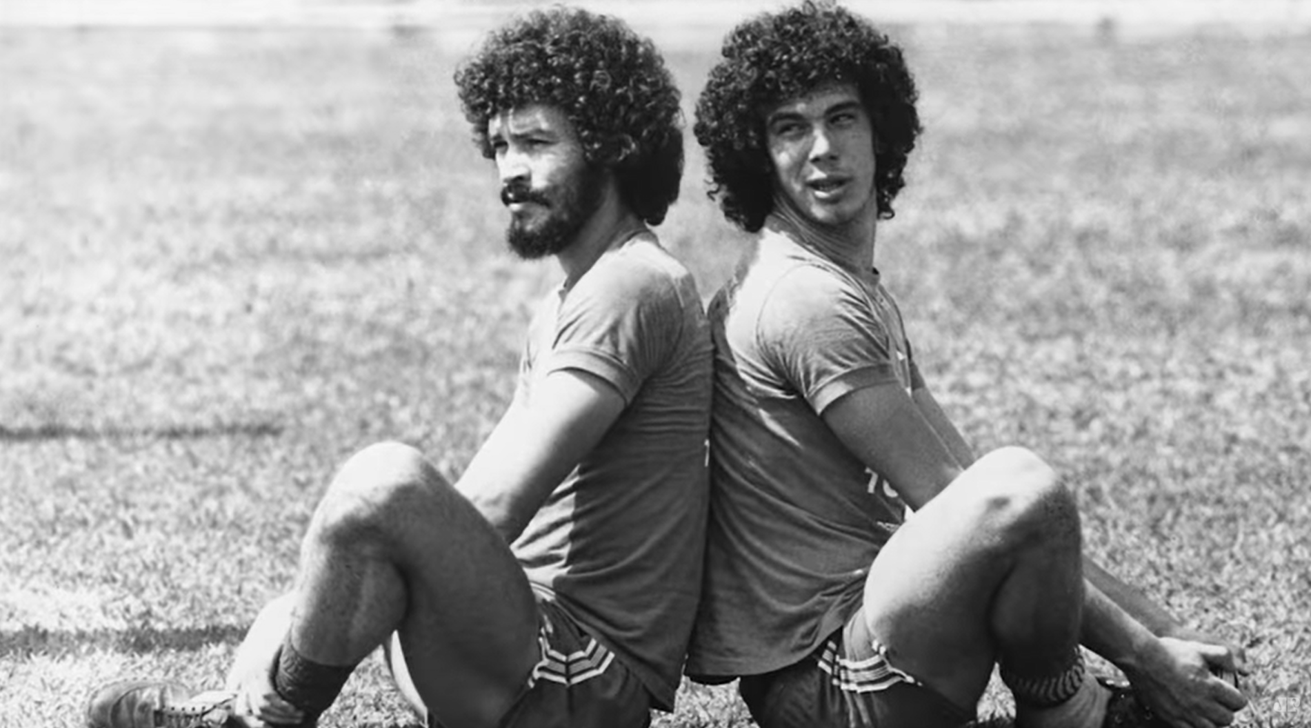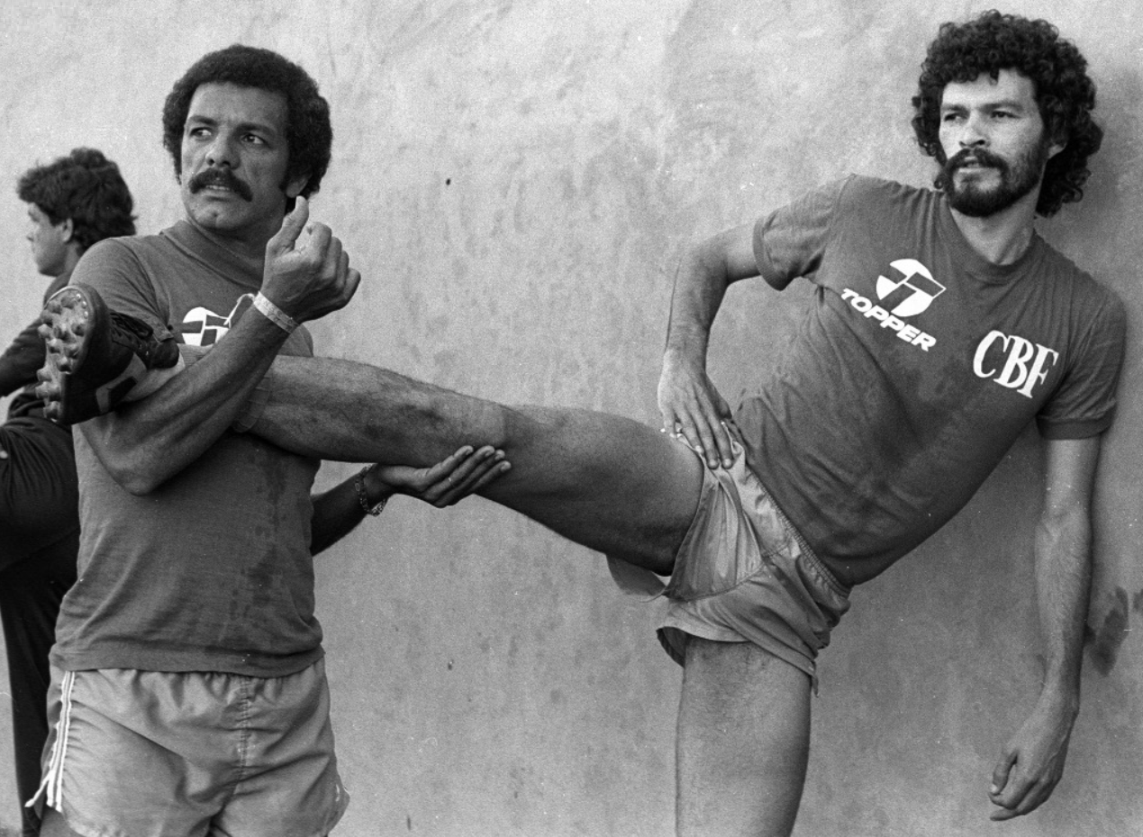 Sócrates fazendo alongamento com Júnior, companheiro de seleção brasileira.