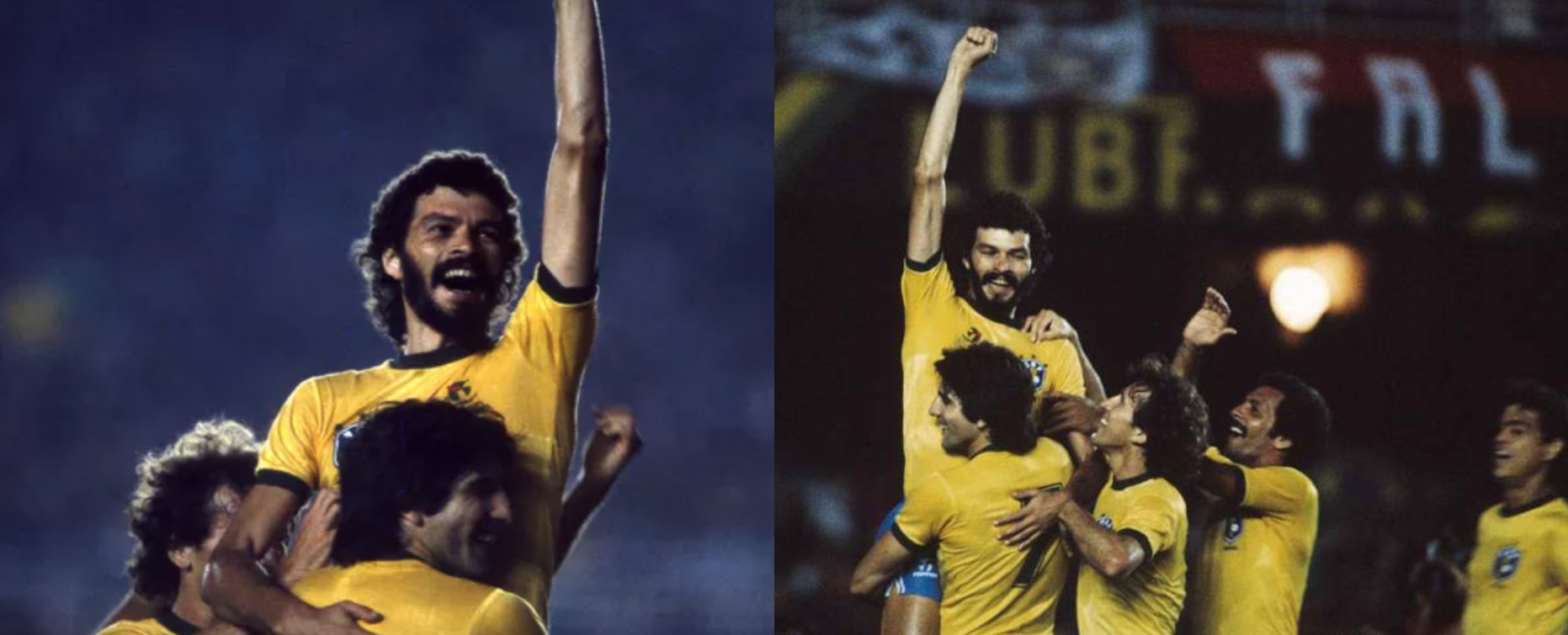 Sócrates comemorando gol, com Renato Gaúcho, Zico, Júnior e Edinho.