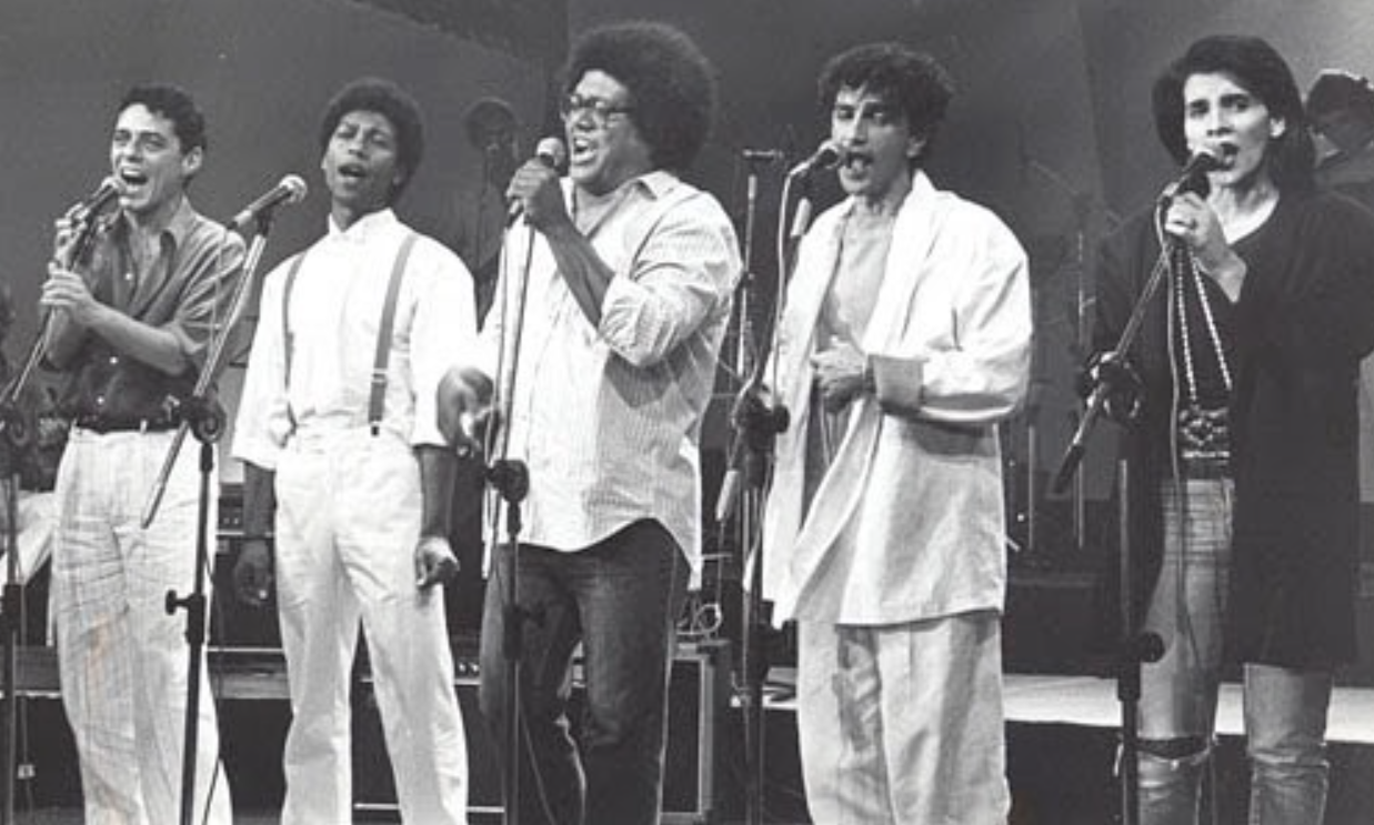 Pablo Milanés, em 1986, canta ao centro, com Chico Buarque, Djavan, Caetano Veloso e Marina.