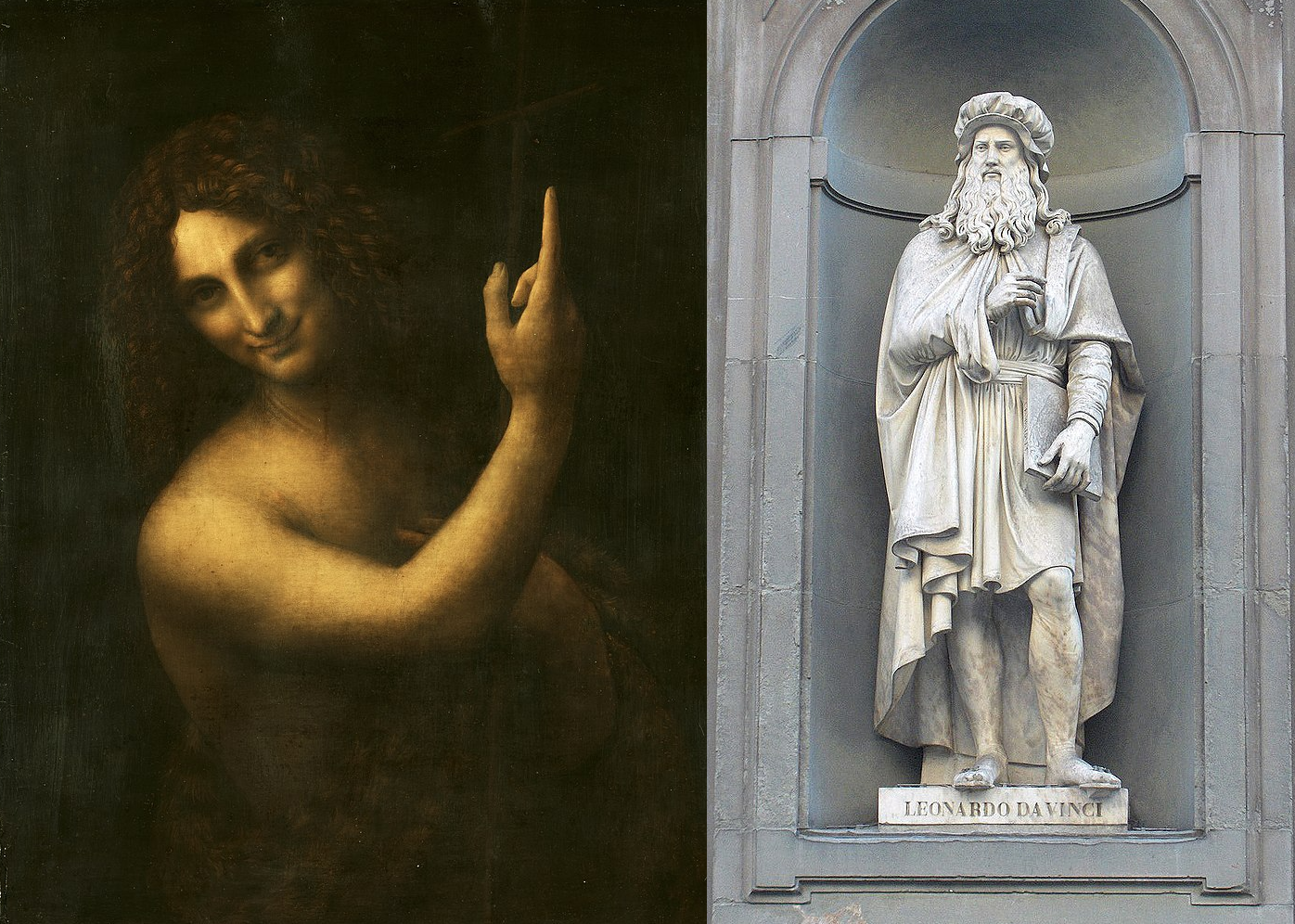 A obra à esquerda é ‘Salai’, criado de Leonardo da Vinci, como São João Batista, c. 1514 – Louvre, à direita, Estátua na Galleria degli Uffizi.