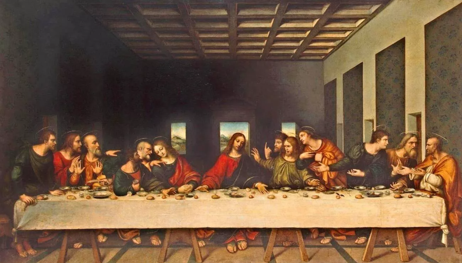 A pintura apresenta a Última Ceia, partilhada por Jesus com seus discípulos, antes de sua captura e execução.