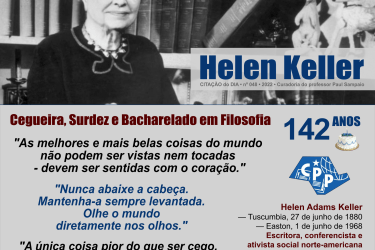 “As melhores e mais belas coisas do mundo não podem ser vistas nem tocadas – devem ser sentidas com o coração” • “Nunca abaixe a cabeça. Mantenha-a sempre levantada. Olhe o mundo diretamente nos olhos.” • Helen Keller, escritora, conferencista e ativista social norte-americana.