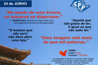 “Na queda de uma árvore, os macacos se dispersam.” – Significado: Quando um líder perde força, seus seguidores tornam-se desorganizados • “Aquele que não gosta de ler, é igual ao que não sabe ler.” • “Uma imagem vale mais do que mil palavras” – A civilização chinesa é uma das mais antigas