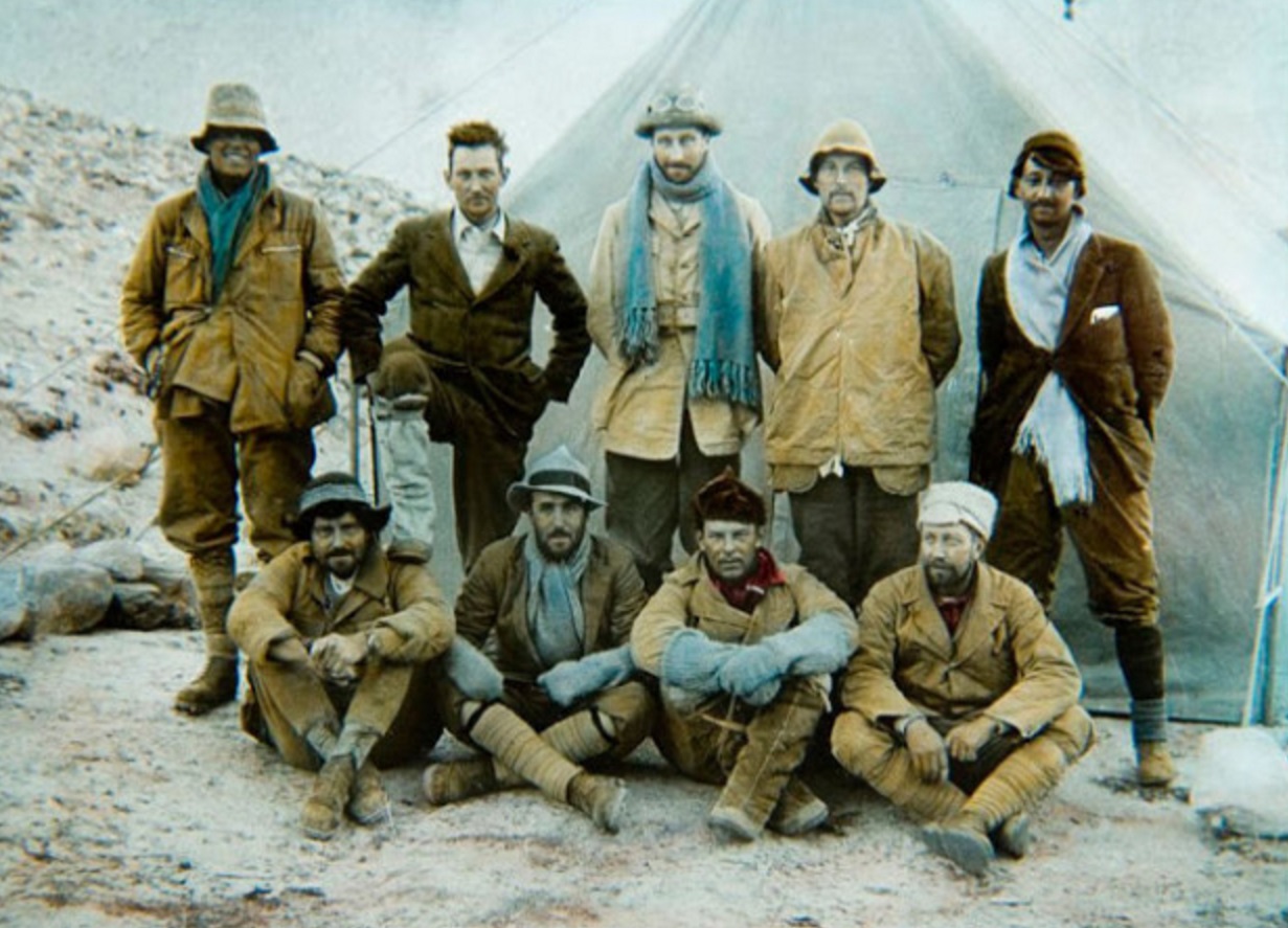 Andrew Irvine (primeiro à esq., em pé) e George Mallory (segundo à esq., em pé), montanhistas que morreram no Monte Everest.