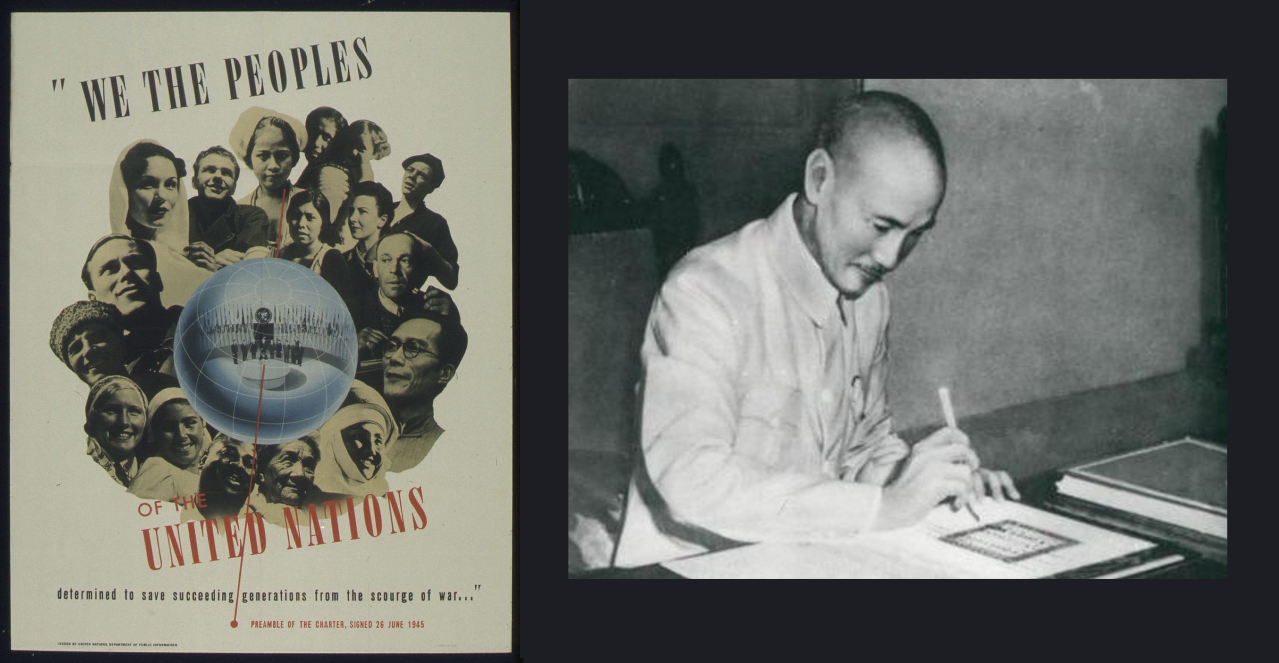 Na foto, cartaz de promoção da ‘Carta’, e o líder chinês, Chiang Kai-shek, assinando a Carta das Nações Unidas.