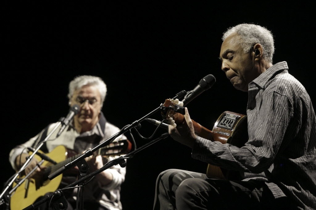 Caetano Veloso e Gilberto Gil tocando juntos durante um show.