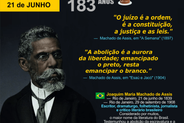 “A abolição é a aurora da liberdade; emancipado o preto, resta emancipar o branco.” — Machado de Assis, em “Esaú e Jacó” (1904) • “O juízo é a ordem, é a constituição, a justiça e as leis.” — em “A Semana” (1897) • Machado de Assis, escritor, dramaturgo e jornalista brasileiro.
