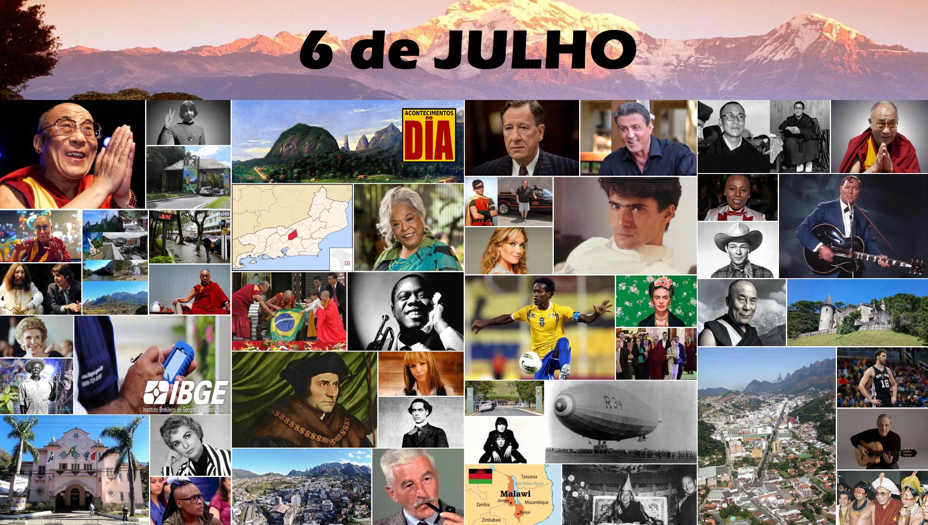 ♦ CIDADE • Teresópolis (RJ) 131 Anos ♥ Aniversário de Dalai Lama Tenzin Gyatso 87 Anos • Frida Kahlo • Nancy Reagan • Bill Haley • Janet Leigh • Della Reese • Burt Ward • Sylvester Stallone • Toquinho • Arnaldo Baptista • Geoffrey Rush • Lauro Corona • Babi Xavier • Zé Roberto • Luize Altenhofen • Pau Gasol ♣ ÓBITOS • Sir Thomas More • Castro Alves • William Faulkner • Louis Armstrong • Raimundo Serra • Roy Rogers