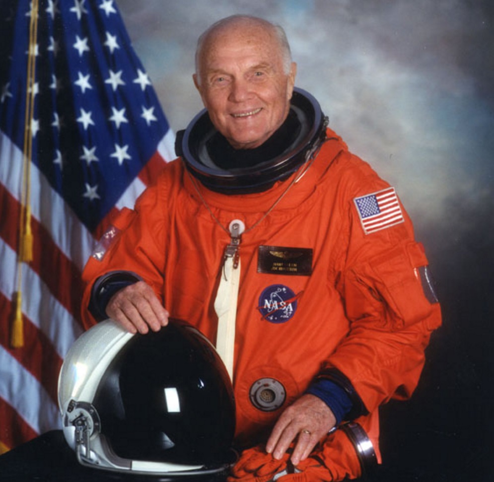 1921 – John H. Glenn, Jr. ▒ John Herschel Glenn Jr. (Cambridge, 18 de julho de 1921 – Columbus, 8 de dezembro de 2016) foi o primeiro astronauta norte- americano a entrar em órbita da Terra, a bordo da cápsula espacial Friendship 7, em 20 de fevereiro de 1962. Foi selecionado pela NASA para o primeiro grupo de astronautas americanos, o Projeto Mercury.