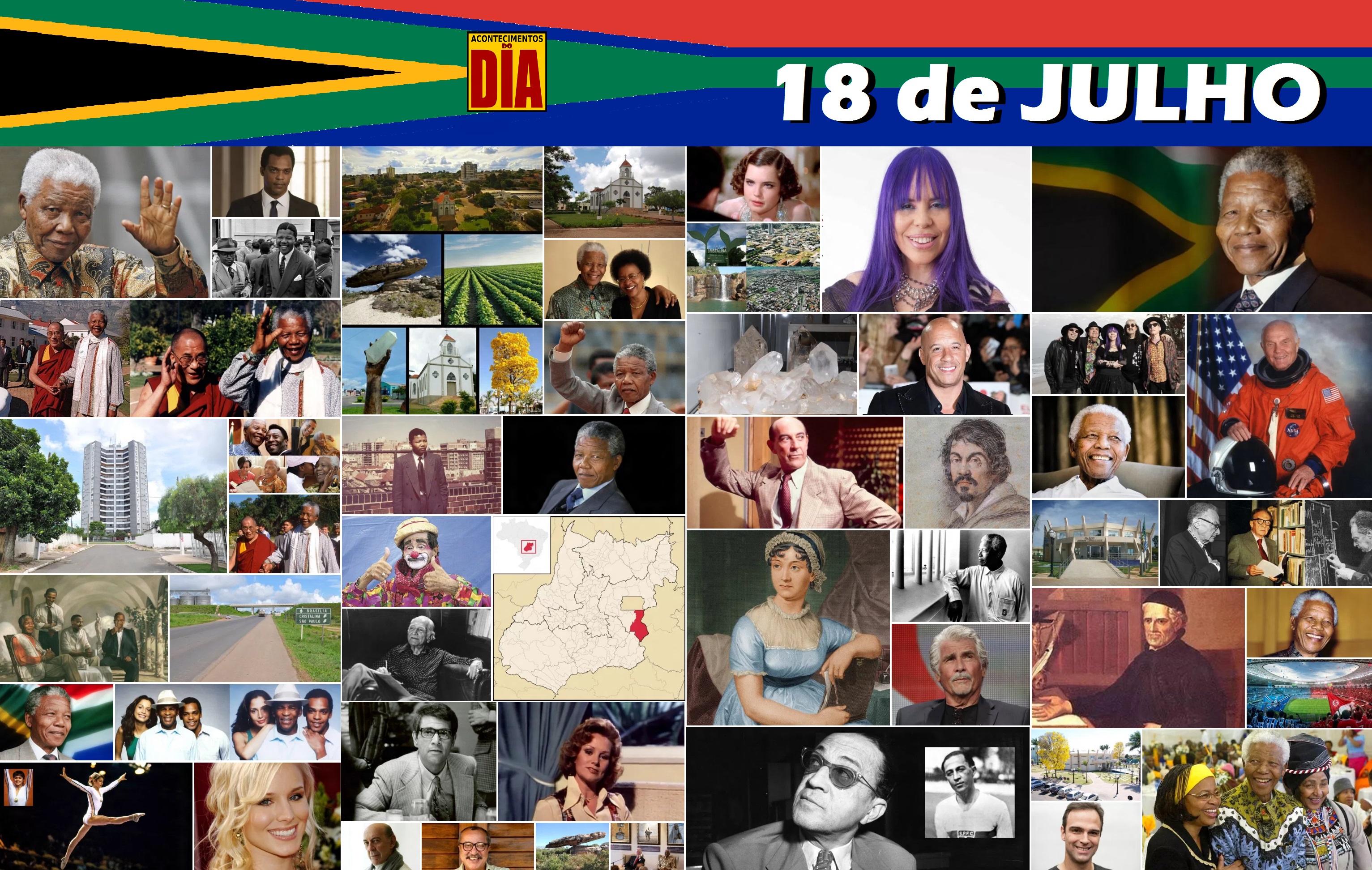 ♦ CIDADE • Cristalina (GO) 106 Anos ♥ Aniversário de Nelson Mandela 104 Anos • Baby Consuelo • Elizabeth McGovern • Vin Diesel • Tadeu Schmidt • Kristen Bell • Rocco Pitanga • Arthur Friedenreich • Carequinha • John Glenn • James Brolin ♣ ÓBITOS • Caravaggio • António Vieira • Jane Austen • Roman Jakobson • Gilberto Freyre • Eliana Macedo • Raul Cortez • João Ubaldo Ribeiro • Alex Rocco