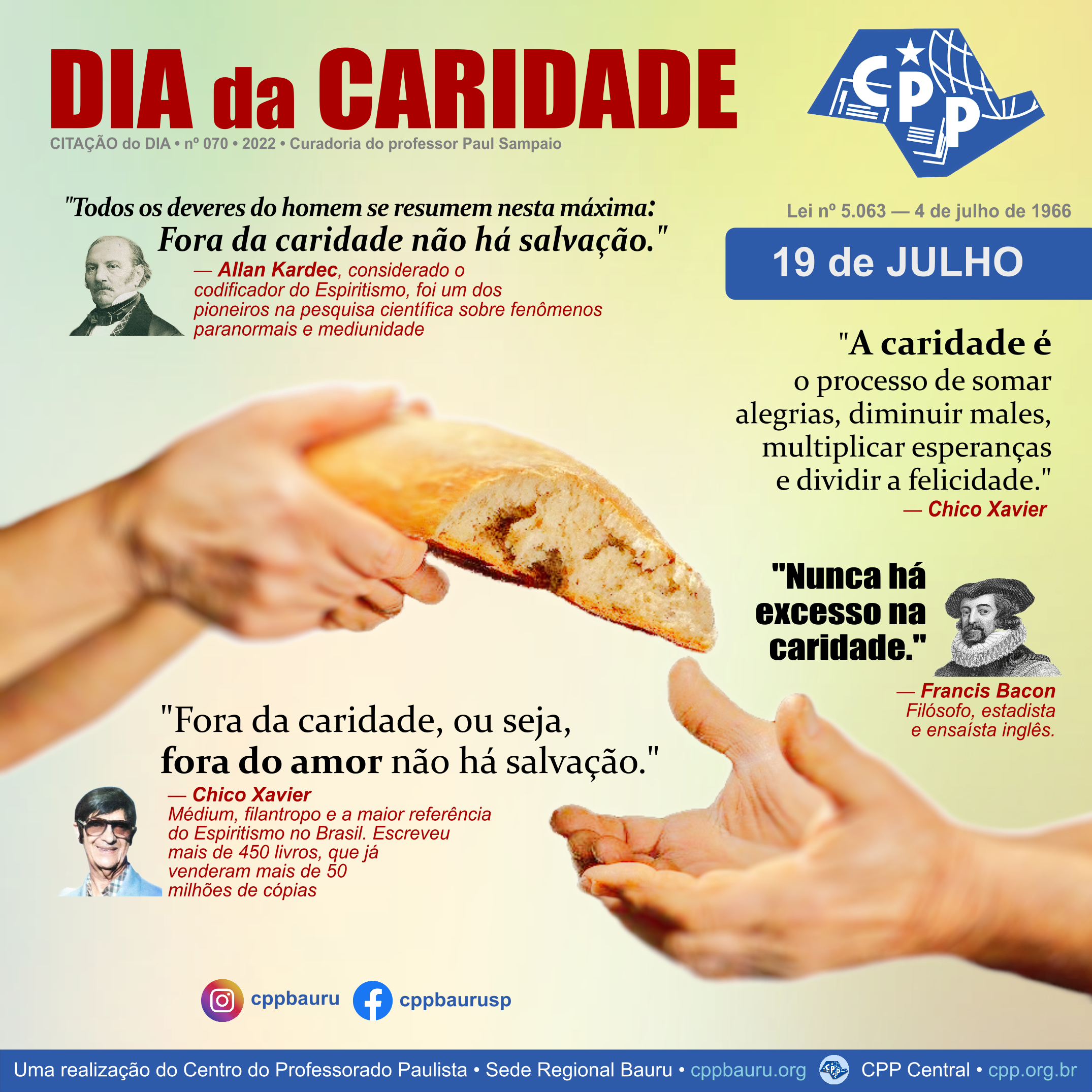 “A caridade é o processo de somar alegrias, diminuir males, multiplicar esperanças e dividir a felicidade para que a Terra se realize na condição do esperado Reino de Deus.”
