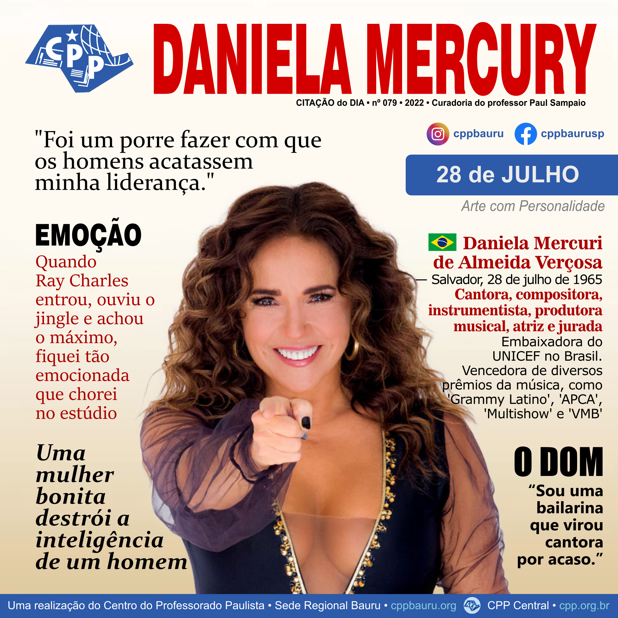 Daniela Mercuri de Almeida Verçosa OMC, conhecida apenas como Daniela Mercury, nome artístico de (Salvador, 28 de julho de 1965), é uma cantora, compositora, instrumentista, produtora musical, atriz e jurada de talent shows luso-brasileira. [3]